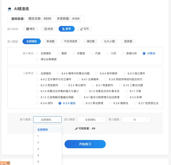 而且,在课堂之外,我还辅以AI精准练习,针对自己的薄弱环节进行高效提升,比如排列组合、集合问题等,这些曾经是我认知中的“难点”,但通过智能化练习和专项强化已经被攻克。这种针对性和计划性的学习方法让我在备考阶段能够以更平和的心态去应对数学部分,从单题入手到整体优化。